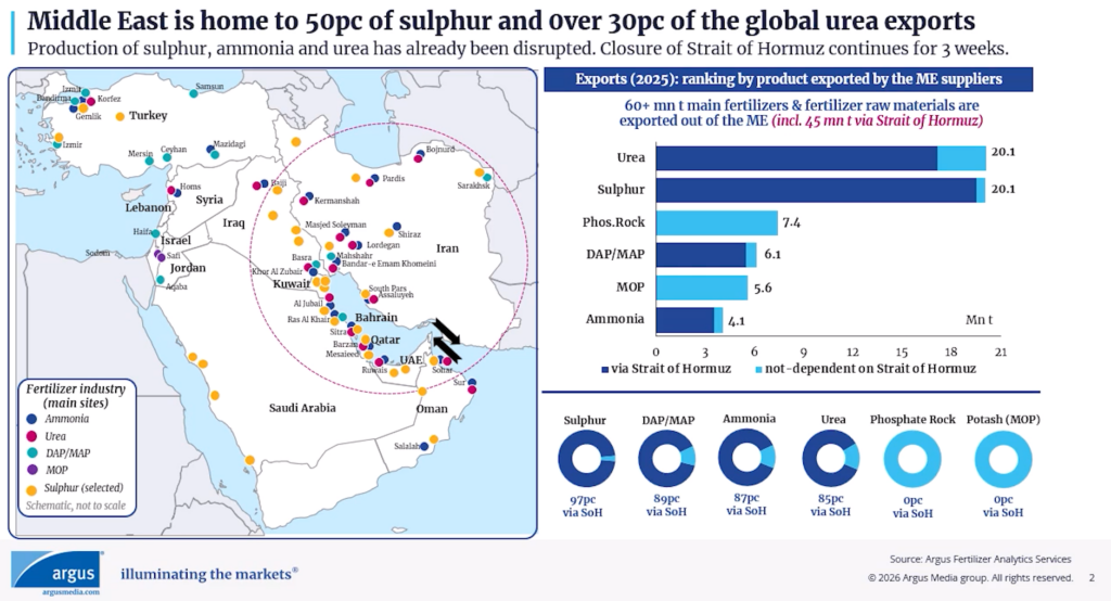 A significant share of global seaborne trade in urea, sulphur, ammonia and phosphates passes through the Strait of Hormuz. When that route is disrupted, the effects are felt immediately across international markets.