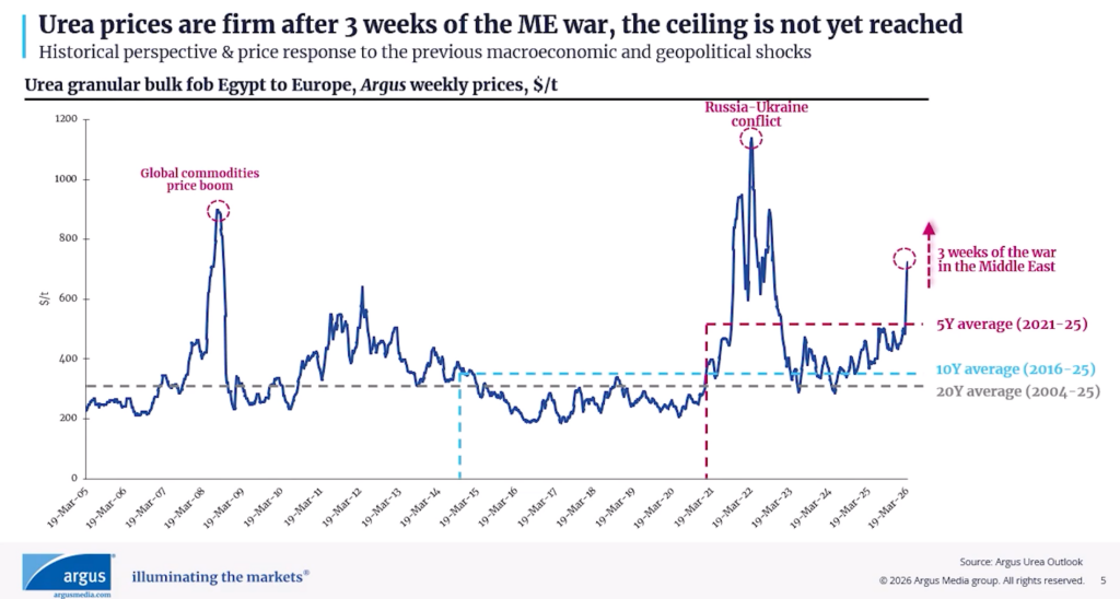 Urea has been the most affected product so far. In several markets, prices have risen sharply compared to pre-escalation levels. Ammonia has also moved significantly higher. DAP and MAP have followed the same direction, partly because of tightness in sulphur supply and the indirect impact on phosphate production outside the Gulf. Sulphur itself was already trading at elevated levels earlier this year and has now become even more difficult to source.