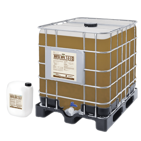 Biota NPK 7-2-3 liquid fertilizer in large IBC container and 20L jerrycan